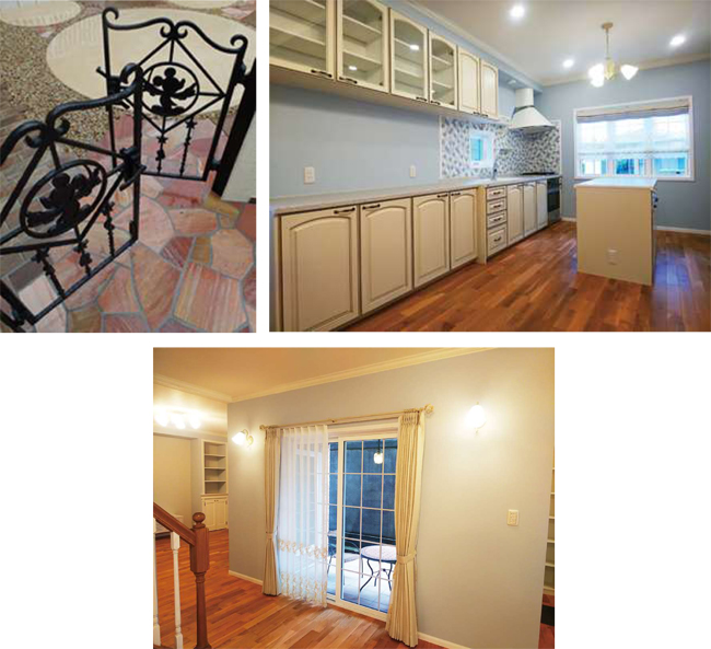 内観は上品で美しい内装。キッチンはデザイン性だけでなく収納力も兼ねた、ホワイトとブルーのコントラストが美しいアイランド型。リビングからテラスへ出られる、中庭タイプの間取りでプライベート空間を実現。ミッキーマウスのかわいい門扉がお出迎えしてくれます。