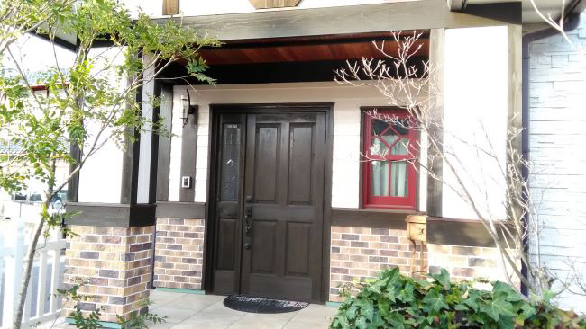 当初は、よろい部分をホワイト色・見切り部分をオーク色でしたが、見切り部分に杉材を使用した関係で「あく」が出て黒ずんでしまったためオーク色にブラック色を調合して仕上げました。