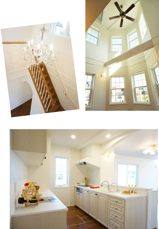 内観は、シャンデリアが似合うエレガントで上品な雰囲気。開放感のある吹抜けや、ホワイトのキッチンなど、S様のこだわりがたくさん詰まった素敵なお家が完成しました。