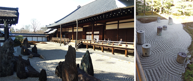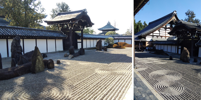 方丈を中心とし、東西南北の四方にそれぞれ違った庭園が設計されています。日本の伝統的な様式「枯山水」に京都の五山を表現した山や、北斗七星を表現している石、また苔が綺麗な市松模様の庭園。何か抹茶のお菓子のような、何とも言えない可愛さもあり、それぞれに目を楽しませてくれるお庭でした。