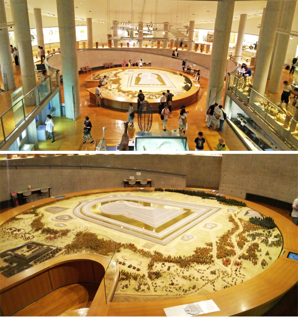 中に展示されているのは古墳に関するものですが、最近話題の世界文化遺産に登録されると言われている、「百舌鳥・古市古墳群」にある日本最大規模の前方後円墳「仁徳天皇陵古墳」の模型が展示されています。世界一の大きさとも言われていますよ! 驚きなのはこの模型、なんと3億円もの費用が掛っているそうです!(◎_◎;)