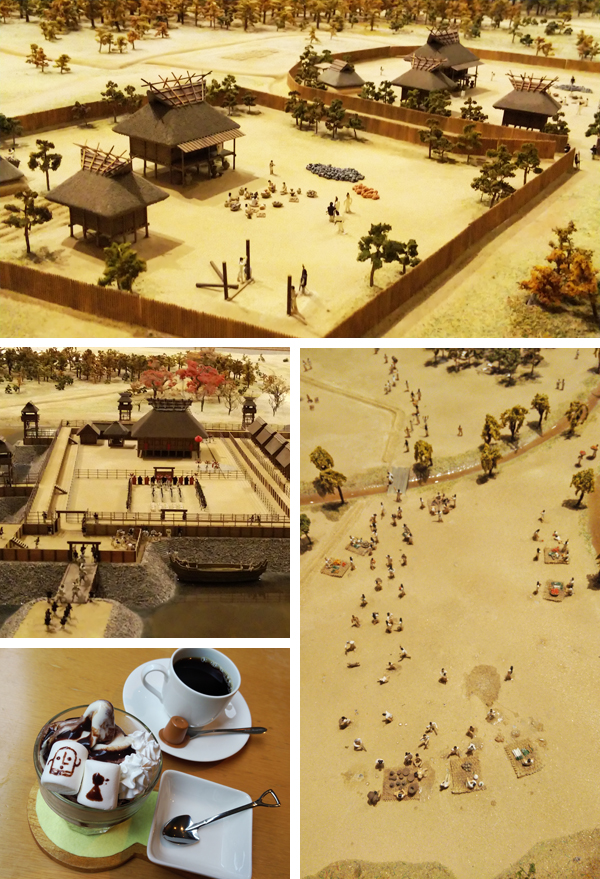 150分の1の縮尺で、昔の古墳づくりの様子や、当時の人々の様子が細部にまで再現されています。人々の動きが一人一人違っていて、本当に細かい所まで作り込んでいました。なかなか見応え有ります!最後に館内にある喫茶店で、「古墳パフェ」を美味しく頂きました。コースターも前方後円墳の形になっていて、スプーンはスコップの形をしていました。(*^▽^*)