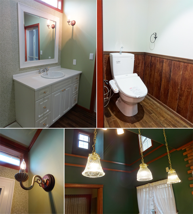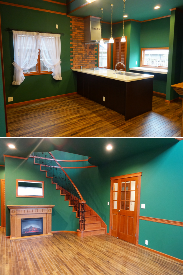LDKに入ってまず目を奪われるのが、美しい弧を描くサーキュラー階段。また、ダイニング・リビング・階段上の3ヶ所の大きな吹抜けが、開放感ある極上の心地よさを演出しています。さらに、ご主人こだわりの電気暖炉や、お二人が最後までこだわられた深い緑色の壁紙が、まるで外国映画のセットのような輸入住宅らしい空間を実現しました。