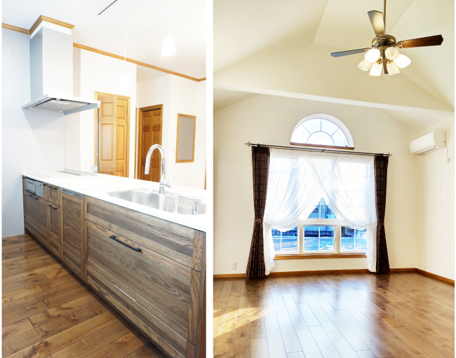 重厚感を演出する落ち着きのあるトーン色の配色でまとめた内観。リビングは勾配天井となっており、空間に広がりを与えてくれます。自分らしい豊かな人生を楽しめる、上質な住まいが完成しました。