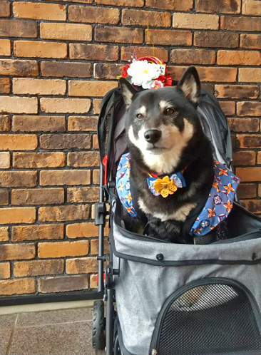 花の飾りをつけられ、いやな顔もしています。