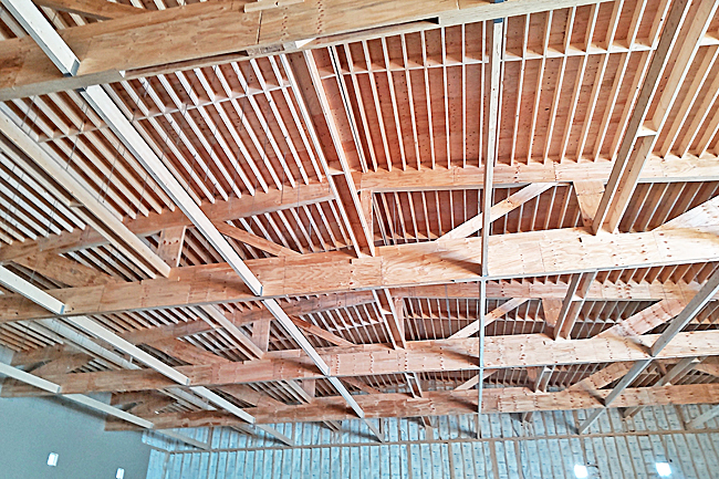 木造と聞くと、柱や壁がいっぱい並んでいて、広い空間を造ることが出来ないというイメージがありましたが、今回の構造見学会で、屋根の部分を、三角形を基本としたトラス構造という考え方で設計すると、20m以上、柱や壁が無くても成立するということを説明していただきました。