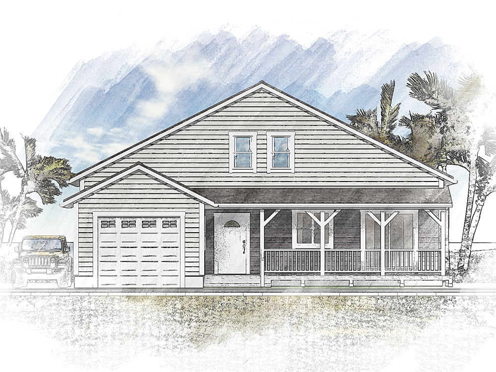 なだらかな切妻勾配屋根とラップサイディングの外壁、白いシングルハング窓、カバードポーチが外観の特徴とするカリフォルニアスタイルハウス。