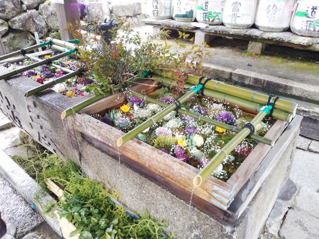 コロナ過で手水鉢も花を浮かべて「花手水」としてありました。