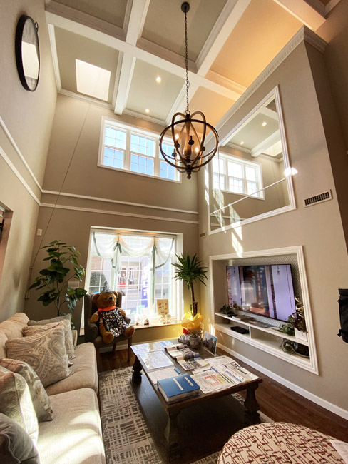入ってすぐのリビングの吹抜に様々な装飾が施され、とても贅沢な空間でした。