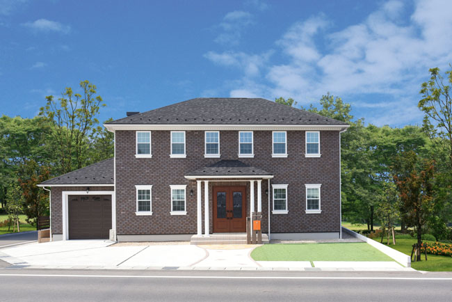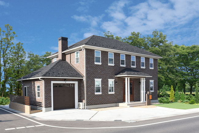 ビルトインガレージとレンガ張りの外壁が、輸入住宅らしさを演出します。