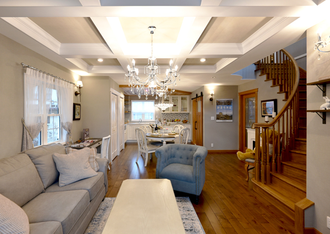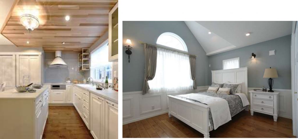 内観は、海外インテリアではよく採用される、格子状に意匠されたリビング天井で、 装飾性を高めました。優美な空間を演出してくれるサーキュラー階段や、シャンデリアがより一層美しさを引きたててくれます。キッチンは、アンティークな雰囲気が漂うカナダ製のメリットキッチンを採用。天井にはレッドシダー張りを施し、空間のアクセントに。半円窓からやさしい日差しが入る主寝室。床材にはアルダー材を使用。