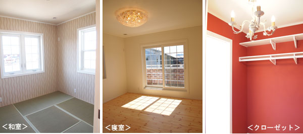 パイン材の床の温もり、窓から射し込む光がやさしい雰囲気の主寝室。クローゼットのクロスは個性的に演出。和室の壁紙もこだわりが光ますね。住むほどに愛着が増す家、S様のこだわりの我が家を完成しました。